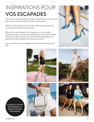 elevated wedge sandals, fresh trainers and handbags in newseason shades, as well as Swarovski crystal-embellished